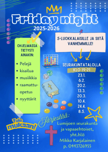 su 1.3. klo 10.00 – 12.00 Kirkko Tervetuloa messuun! Toimittaa Risto Räihä, kanttorina Emilia Soranta. Rukous ja usko Kolehti: Suomen Lähetysseuran humanitaariseen työhön, jolla on tuettu esimerkiksi Ukrainan ja Gazan sodissa kärsineitä. Humanitaarinen apu menee sinne, missä sitä kulloinkin eniten tarvitaan. Tervetuloa! Lumijoen Seurakunnan tapahtumasivulle tästä. Sunnuntaina 1.3.2026 avajaishiihdot klo 12 urheilutalolla Ilmoittautuminen klo 11:45 mennessä. Pakkasraja -15°C. Järjestää: Lumijoen Lumiukot. Tervetuloa hiihtämään! Seuraa LuLua Facebookissa ja Instagramissa. Lumijoen 4H-yhdistys järjestää kaikille sopivan tuolijumpan Lumijoen kirjastolla maanantaisin ja torstaisin alkaen klo 10. Tuolijumpan jälkeen jaamme saatavuuden mukaan hävikkituotteita. Tilaisuuksissa kahvi/tee tarjoilu. Tervetuloa! Tuolijumppa järjestetään Lumijoen kirjasto Hiidenkiven tiloissa Osoitetiedot: Toripolku 3 91980 Lumijoki Järjestetään 90 kertaa, 09.02.2026-17.12.2026 Joka viikko Ma 10:00-11:30, To 10:00-11:30 Tule tekemään löytöjä, tuotteet ovat ilmaisia! HelpCenter LumiJobissa otetaan vastaan puhtaita ja ehjiä vaatteita, kenkiä, pyyhkeitä, kattiloita, aterimia, astioita. HelpCenter Lumijoki on avoinna: ma klo 12-14 pe klo 15-17 Lumijoentie 1226, 91980 Lumijoki. Lisätietoja: Sirkka Kyrö p. 040 575 3591 Lumijoen Seurakunta järjestää kevät- ja syyskaudella päiväkerhotoimintaa 3-5-vuotiaille lapsille. Kerhoryhmät kokoontuvat maanantaisin ja keskiviikkoisin klo 12-14. Kerhotoiminnasta vastaa lastenohjaaja Päivi Varjus p. 044 775 0601. Kysy Päiviltä vapaista kerhopaikoista. Järjestää: Lumijoen Seurakunta Lue lisää aiheesta Lumijoen Seurakunta; Toimintaa lapsille ja lapsiperheille tästä. Huom. Talvilomaviikolla 10 yhdistysten ja seurojen vuoroissa voi olla yhdistys-/seurakohtaisia poikkeuksia. Maanantaisin klo 18 liikuntahallilla. TERVETULOA, LIIKUNTA ON HAUSKAA! Satujumppa on VAIN alle kouluikäisille sekä eskarilaisille AIKUISEN seurassa. Järjestää: Lumijoen nuorisoseura ry Järjestämme kaikille avoimen tuolijumpan sekä pientä hävikkiruuan jakoa tilanteen mukaan. Tapahtumissa kahvi/tee tarjoilu. Lumijoen 4H-yhdistys järjestää kaikille sopivan tuolijumpan Lumijoen kirjastolla maanantaisin ja torstaisin alkaen klo 10. Tuolijumpan jälkeen jaamme saatavuuden mukaan hävikkituotteita. Tilaisuuksissa kahvi/tee tarjoilu. Tervetuloa! Tuolijumppa järjestetään Lumijoen kirjasto Hiidenkiven tiloissa Osoitetiedot: Toripolku 3 91980 Lumijoki Järjestetään 90 kertaa, 09.02.2026-17.12.2026 Joka viikko Ma 10:00-11:30, To 10:00-11:30 Tule tekemään löytöjä, tuotteet ovat ilmaisia! HelpCenter LumiJobissa otetaan vastaan puhtaita ja ehjiä vaatteita, kenkiä, pyyhkeitä, kattiloita, aterimia, astioita. HelpCenter Lumijoki on avoinna: ma klo 12-14 pe klo 15-17 Lumijoentie 1226, 91980 Lumijoki. Lisätietoja: Sirkka Kyrö p. 040 575 3591 Lumijoen Seurakunta järjestää kevät- ja syyskaudella päiväkerhotoimintaa 3-5-vuotiaille lapsille. Kerhoryhmät kokoontuvat maanantaisin ja keskiviikkoisin klo 12-14. Kerhotoiminnasta vastaa lastenohjaaja Päivi Varjus p. 044 775 0601. Kysy Päiviltä vapaista kerhopaikoista. Järjestää: Lumijoen Seurakunta Lue lisää aiheesta Lumijoen Seurakunta; Toimintaa lapsille ja lapsiperheille tästä. Huom. Talvilomaviikolla 10 yhdistysten ja seurojen vuoroissa voi olla yhdistys-/seurakohtaisia poikkeuksia. Maanantaisin klo 18 liikuntahallilla. TERVETULOA, LIIKUNTA ON HAUSKAA! Satujumppa on VAIN alle kouluikäisille sekä eskarilaisille AIKUISEN seurassa. Järjestää: Lumijoen nuorisoseura ry Digituen tarkoituksena on ohjata ja tukea hyvinvointialueen digitaalisten sosiaali- ja terveyspalvelujen käytössä. Tee/kahvi ja pullatarjoilu Voit saada tukea esimerkiksi Koulutus on Lumijoen kirjasto Hiidenkiven tiloissa Osoitetiedot Toripolku 3 91980 Lumijoki Järjestää: Lumijoen 4H-yhdistys ry Ajankohta Joka viikko Ti 10:00-12:00 Seuraavat 10 tapahtumaa: Lisätietoja tästä. Tiistaisin ja perjantaisin klo 10 – 11 Lumijoen Nuorisotila Nöre Tule mukaan perinteiseen ukkokerhoon, jonka juuret ulottuvat vuosikymmenten taakse! Kerhossa vaihdetaan ajatuksia päivän polttavista aiheista, ajankohtaisista tapahtumista, maailman menosta ja yleisistä ilmiöistä – ilman politiikkaa. Rento ja mukava ilmapiiri kutsuu keskustelemaan, kuuntelemaan ja viihtymään yhdessä, tervetuloa! Kaikille avoin ja maksuton kuntosalivuoro Lumijoen liikuntahallilla. Järjestää: Eläkeliiton Lumijoen yhdistys Tervetuloa! Kuntosalillakin käy mukavasti porukkaa keskiviikkoisin klo 12.00-14.00 Kaikille avoin ja maksuton kuntosalivuoro Lumijoen liikuntahallilla. Järjestää: Eläkeliiton Lumijoen yhdistys Tervetuloa! Huom. Talvilomaviikolla 10 yhdistysten ja seurojen vuoroissa voi olla yhdistys-/seurakohtaisia poikkeuksia. Tarkista talvilomaviikon tietojen ajankohtaisuus ko. yhdistyksestä. Tervetuloa Perhekahvilaan viihtymään! Leikkiä, iloa ja vertaistukea. Kahvi- ja mehutarjoilu. Järjestää: Mannerheimin Lastensuojeluliiton Lumijoen yhdistys. Seuraa somessa: https://www.instagram.com/mll_lumijoki/ Lämpimästi tervetuloa! Huom. Talvilomaviikolla 10 yhdistysten ja seurojen vuoroissa voi olla yhdistys-/seurakohtaisia poikkeuksia. Tarkista talvilomaviikon tietojen ajankohtaisuus ko. yhdistyksestä. Järjestämme kaikille avoimen tuolijumpan sekä pientä hävikkiruuan jakoa tilanteen mukaan. Tapahtumissa kahvi/tee tarjoilu. Lumijoen 4H-yhdistys järjestää kaikille sopivan tuolijumpan Lumijoen kirjastolla maanantaisin ja torstaisin alkaen klo 10. Tuolijumpan jälkeen jaamme saatavuuden mukaan hävikkituotteita. Tilaisuuksissa kahvi/tee tarjoilu. Tervetuloa! Tuolijumppa järjestetään Lumijoen kirjasto Hiidenkiven tiloissa Osoitetiedot: Toripolku 3 91980 Lumijoki Järjestetään 90 kertaa, 09.02.2026-17.12.2026 Joka viikko Ma 10:00-11:30, To 10:00-11:30 Kaikille avoin ja maksuton kuntosalivuoro Lumijoen liikuntahallilla. Järjestää: Eläkel