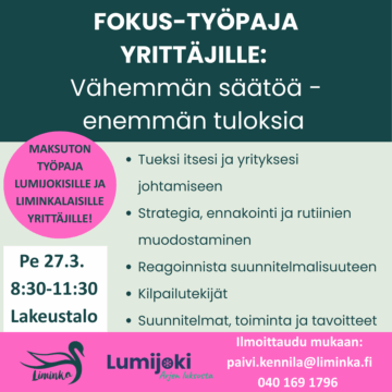 Kirjailijavierailu Lumijoen kirjasto Hiidenkivessä torstaina 26.3. klo 17.30 alkaen.Fokus työpaja yrittäjille: vähemmän säätöä – enemmän tuloksia