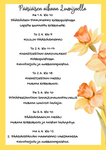 su 1.3. klo 10.00 – 12.00 Kirkko Tervetuloa messuun! Toimittaa Risto Räihä, kanttorina Emilia Soranta. Rukous ja usko Kolehti: Suomen Lähetysseuran humanitaariseen työhön, jolla on tuettu esimerkiksi Ukrainan ja Gazan sodissa kärsineitä. Humanitaarinen apu menee sinne, missä sitä kulloinkin eniten tarvitaan. Tervetuloa! Lumijoen Seurakunnan tapahtumasivulle tästä. Sunnuntaina 1.3.2026 avajaishiihdot klo 12 urheilutalolla Ilmoittautuminen klo 11:45 mennessä. Pakkasraja -15°C. Järjestää: Lumijoen Lumiukot. Tervetuloa hiihtämään! Seuraa LuLua Facebookissa ja Instagramissa. Lumijoen 4H-yhdistys järjestää kaikille sopivan tuolijumpan Lumijoen kirjastolla maanantaisin ja torstaisin alkaen klo 10. Tuolijumpan jälkeen jaamme saatavuuden mukaan hävikkituotteita. Tilaisuuksissa kahvi/tee tarjoilu. Tervetuloa! Tuolijumppa järjestetään Lumijoen kirjasto Hiidenkiven tiloissa Osoitetiedot: Toripolku 3 91980 Lumijoki Järjestetään 90 kertaa, 09.02.2026-17.12.2026 Joka viikko Ma 10:00-11:30, To 10:00-11:30 Sanan sävel- perheen yhteinen matka taiteen maailmassa. Olemme muovanneet muotoja, joissa näkyy rakkaus, luovuus ja yhdessä tekemisen ilo. Jokainen työ kantaa tekijänsä kädenjälkeä – pehmeää kosketusta ja kertoo hetkistä, muistosta. Arja Kiviahde, Nina Pernu, Mari Okkonen, Heidi Jussila, Anna Kiviahde, Amelia Pernu, Beada Jussila ja Livia Jussila Tule tekemään löytöjä, tuotteet ovat ilmaisia! HelpCenter LumiJobissa otetaan vastaan puhtaita ja ehjiä vaatteita, kenkiä, pyyhkeitä, kattiloita, aterimia, astioita. HelpCenter Lumijoki on avoinna: ma klo 12-14 pe klo 15-17 Lumijoentie 1226, 91980 Lumijoki. Lisätietoja: Sirkka Kyrö p. 040 575 3591 Lumijoen Seurakunta järjestää kevät- ja syyskaudella päiväkerhotoimintaa 3-5-vuotiaille lapsille. Kerhoryhmät kokoontuvat maanantaisin ja keskiviikkoisin klo 12-14. Kerhotoiminnasta vastaa lastenohjaaja Päivi Varjus p. 044 775 0601. Kysy Päiviltä vapaista kerhopaikoista. Järjestää: Lumijoen Seurakunta Lue lisää aiheesta Lumijoen Seurakunta; Toimintaa lapsille ja lapsiperheille tästä. Huom. Talvilomaviikolla 10 yhdistysten ja seurojen vuoroissa voi olla yhdistys-/seurakohtaisia poikkeuksia. Maanantaisin klo 18 liikuntahallilla. TERVETULOA, LIIKUNTA ON HAUSKAA! Satujumppa on VAIN alle kouluikäisille sekä eskarilaisille AIKUISEN seurassa. Järjestää: Lumijoen nuorisoseura ry Järjestämme kaikille avoimen tuolijumpan sekä pientä hävikkiruuan jakoa tilanteen mukaan. Tapahtumissa kahvi/tee tarjoilu. Lumijoen 4H-yhdistys järjestää kaikille sopivan tuolijumpan Lumijoen kirjastolla maanantaisin ja torstaisin alkaen klo 10. Tuolijumpan jälkeen jaamme saatavuuden mukaan hävikkituotteita. Tilaisuuksissa kahvi/tee tarjoilu. Tervetuloa! Tuolijumppa järjestetään Lumijoen kirjasto Hiidenkiven tiloissa Osoitetiedot: Toripolku 3 91980 Lumijoki Järjestetään 90 kertaa, 09.02.2026-17.12.2026 Joka viikko Ma 10:00-11:30, To 10:00-11:30 Sanan sävel- perheen yhteinen matka taiteen maailmassa. Olemme muovanneet muotoja, joissa näkyy rakkaus, luovuus ja yhdessä tekemisen ilo. Jokainen työ kantaa tekijänsä kädenjälkeä – pehmeää kosketusta ja kertoo hetkistä, muistosta. Arja Kiviahde, Nina Pernu, Mari Okkonen, Heidi Jussila, Anna Kiviahde, Amelia Pernu, Beada Jussila ja Livia Jussila Tule tekemään löytöjä, tuotteet ovat ilmaisia! HelpCenter LumiJobissa otetaan vastaan puhtaita ja ehjiä vaatteita, kenkiä, pyyhkeitä, kattiloita, aterimia, astioita. HelpCenter Lumijoki on avoinna: ma klo 12-14 pe klo 15-17 Lumijoentie 1226, 91980 Lumijoki. Lisätietoja: Sirkka Kyrö p. 040 575 3591 Lumijoen Seurakunta järjestää kevät- ja syyskaudella päiväkerhotoimintaa 3-5-vuotiaille lapsille. Kerhoryhmät kokoontuvat maanantaisin ja keskiviikkoisin klo 12-14. Kerhotoiminnasta vastaa lastenohjaaja Päivi Varjus p. 044 775 0601. Kysy Päiviltä vapaista kerhopaikoista. Järjestää: Lumijoen Seurakunta Lue lisää aiheesta Lumijoen Seurakunta; Toimintaa lapsille ja lapsiperheille tästä. Huom. Talvilomaviikolla 10 yhdistysten ja seurojen vuoroissa voi olla yhdistys-/seurakohtaisia poikkeuksia. Maanantaisin klo 18 liikuntahallilla. TERVETULOA, LIIKUNTA ON HAUSKAA! Satujumppa on VAIN alle kouluikäisille sekä eskarilaisille AIKUISEN seurassa. Järjestää: Lumijoen nuorisoseura ry Digituen tarkoituksena on ohjata ja tukea hyvinvointialueen digitaalisten sosiaali- ja terveyspalvelujen käytössä. Tee/kahvi ja pullatarjoilu Voit saada tukea esimerkiksi Koulutus on Lumijoen kirjasto Hiidenkiven tiloissa Osoitetiedot Toripolku 3 91980 Lumijoki Järjestää: Lumijoen 4H-yhdistys ry Ajankohta Joka viikko Ti 10:00-12:00 Seuraavat 10 tapahtumaa: Lisätietoja tästä. Tiistaisin ja perjantaisin klo 10 – 11 Lumijoen Nuorisotila Nöre Tule mukaan perinteiseen ukkokerhoon, jonka juuret ulottuvat vuosikymmenten taakse! Kerhossa vaihdetaan ajatuksia päivän polttavista aiheista, ajankohtaisista tapahtumista, maailman menosta ja yleisistä ilmiöistä – ilman politiikkaa. Rento ja mukava ilmapiiri kutsuu keskustelemaan, kuuntelemaan ja viihtymään yhdessä, tervetuloa! Kaikille avoin ja maksuton kuntosalivuoro Lumijoen liikuntahallilla. Järjestää: Eläkeliiton Lumijoen yhdistys Tervetuloa! Kuntosalillakin käy mukavasti porukkaa keskiviikkoisin klo 12.00-14.00 Kaikille avoin ja maksuton kuntosalivuoro Lumijoen liikuntahallilla. Järjestää: Eläkeliiton Lumijoen yhdistys Tervetuloa! Huom. Talvilomaviikolla 10 yhdistysten ja seurojen vuoroissa voi olla yhdistys-/seurakohtaisia poikkeuksia. Tarkista talvilomaviikon tietojen ajankohtaisuus ko. yhdistyksestä. Tervetuloa Perhekahvilaan viihtymään! Leikkiä, iloa ja vertaistukea. Kahvi- ja mehutarjoilu. Järjestää: Mannerheimin Lastensuojeluliiton Lumijoen yhdistys. Seuraa somessa: https://www.instagram.com/mll_lumijoki/ Lämpimästi tervetuloa! Huom. Talvilomaviikolla 10 yhdistysten ja seurojen vuoroissa voi olla yhdistys-/seurakohtaisia poikkeuksia. 