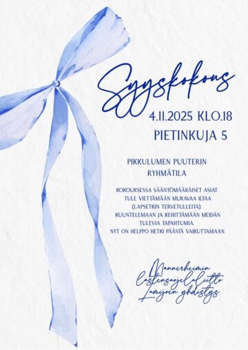 Tule mukaan käsityön kanssa tai ilman! Omien käsitöiden ilta noin kerran kuussa kerhohuoneella (Ylipääntie 11) klo 17-19. Ollaan yhdessä, jutellaan käsitöiden lomassa ja juodaan iltateet. Tervetuloa! Tule mukaan! Järjestää: Lumijoen seurakunta Lue lisää seurakunnan verkkosivulta. Lumijoen kunnanvaltuusto kokoontuu seuraavan kerran maanantaina 10.11.2025 klo 18.30 seurakuntatalolla. Tuleva kokous striimataan kunnan Youtube-kanavalle, josta sitä on mahdollista seurata livenä. Lumijoen kunta Youtubessa: Katso esityslistat ja pöytäkirjat tästä. Tutustu valtuustoon tästä. Lumijoen seuraava kuntatiedote ilmestyy Rantalakeudessa 26.11.2025. Lähetä materiaalisi viimeistään 19.11.2025 osoitteeseen kirjaamo@lumijoki.fi. Tule mukaan! Järjestää: Lumijoen seurakunta Lue lisää seurakunnan verkkosivulta. KE 26.11. klo 17.30 askarellaan Marttalassa joulukortteja. Glögitarjoilua ja pikkusyötävää. *** KE 3.12. ja KE 10.12. klo 18.00 Ilmainen kinkkubingo Pizzeria Meritassa. Pääpalkintona joulukinkku ja pikkupalkintoina mm. jouluherkkuja. Kaikille avoimia tilaisuuksia. Tervetuloa!