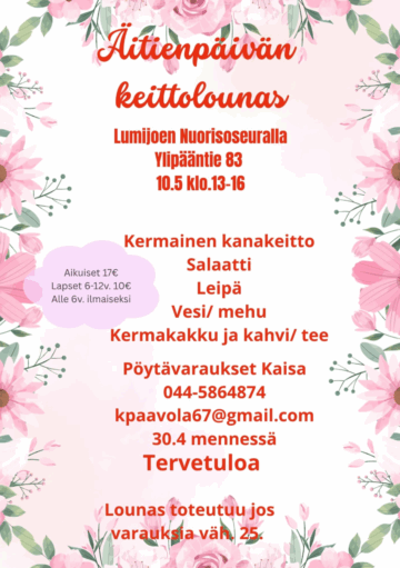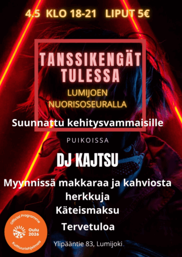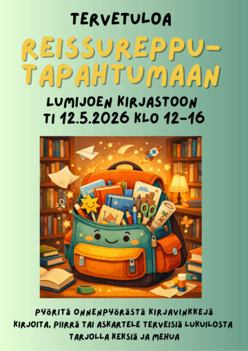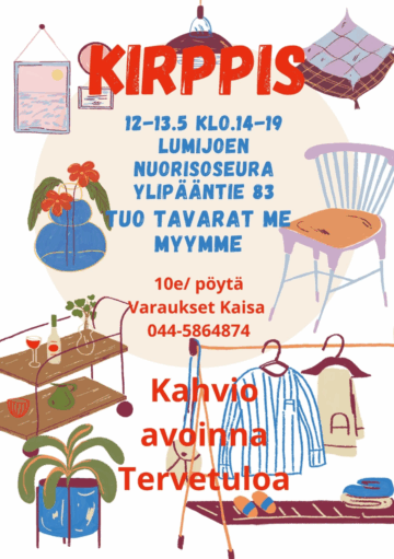 Tiistaisin ja perjantaisin klo 10 – 11 Lumijoen Nuorisotila Nörellä Tule mukaan perinteiseen ukkokerhoon, jonka juuret ulottuvat vuosikymmenten taakse! Kerhossa vaihdetaan ajatuksia päivän polttavista aiheista, ajankohtaisista tapahtumista, maailman menosta ja yleisistä ilmiöistä – ilman politiikkaa. Rento ja mukava ilmapiiri kutsuu keskustelemaan, kuuntelemaan ja viihtymään yhdessä, tervetuloa! Tule tekemään löytöjä, tuotteet ovat ilmaisia! HelpCenter LumiJobissa otetaan vastaan puhtaita ja ehjiä vaatteita, kenkiä, pyyhkeitä, kattiloita, aterimia, astioita. HelpCenter Lumijoki on avoinna: ma klo 12-14 pe klo 15-17 Lumijoentie 1226, 91980 Lumijoki. Lisätietoja: Sirkka Kyrö p. 040 575 3591 Kaikille avoin ja maksuton boccia-peli-ilta, tule rohkeasti mukaan pelaamaan! Aika: klo 17–19 Paikka: Lumijoen liikuntahalli Järjestää: Eläkeliiton Lumijoen yhdistys Eläkeliiton Lumijoen yhdistys ry:n kotisivulle tästä. Eläkeliiton Lumijoen yhdistys ry:n Facebook-sivulle tästä. Mukavaa tekemistä ja seuraa Yhdistyksemme tarjoaa eläkeikäisille mukavaa yhdessäoloa, harrastuksia ja tapahtumia. Toiminnan keskiössä ovat kerhot, retket ja kohtaamiset, joissa syntyy iloa ja yhteisöllisyyttä. Tule mukaan! Kirkko Toimittaa Olli Lohi, kanttorina Emilia Soranta. Taivaan kansalaisena maailmassa Kolehti: Taloudellisessa ahdingossa olevien yksittäisten ihmisten ja perheiden auttamiseen Suomessa Kirkon diakoniarahaston kautta. Kirkkokahvit jumalanpalveluksen jälkeen! Järjestää: Lumijoen seurakunta Lumijoen seurakunnan tapahtumasivulle tästä. Kehitysvammaisille suunnattu disco. Musiikista vastaa Dj Kajtsu. Liput 5€. Tervetuloa! Tapahtuma on osa Oulu2026 kulttuuriohjelmaa. Järjestää: Lumijoen Nuorisoseura ry Lisätietoja Lumijoen Nuorisoseuran verkkosivuilta tästä ja Lumijoen Nuorisoseuran Facebook-sivulta tästä. Lumijoen 4H-yhdistys järjestää kaikille sopivan tuolijumpan Lumijoen kirjastolla maanantaisin ja torstaisin alkaen klo 10. Tuolijumpan jälkeen jaamme saatavuuden mukaan hävikkituotteita. Tilaisuuksissa kahvi/tee tarjoilu. Tervetuloa! Tuolijumppa järjestetään Lumijoen kirjasto Hiidenkiven tiloissa Osoitetiedot: Toripolku 3 91980 Lumijoki Järjestetään 90 kertaa, 09.02.2026-17.12.2026 Joka viikko Ma 10:00-11:30, To 10:00-11:30 Lumijoen Seurakunta järjestää kevät- ja syyskaudella päiväkerhotoimintaa 3-5-vuotiaille lapsille. Kerhoryhmät kokoontuvat maanantaisin ja keskiviikkoisin klo 12-14. Kerhotoiminnasta vastaa lastenohjaaja Päivi Varjus p. 044 775 0601. Kysy Päiviltä vapaista kerhopaikoista. Järjestää: Lumijoen Seurakunta Lue lisää aiheesta Lumijoen Seurakunta; Toimintaa lapsille ja lapsiperheille tästä. Pullakahvit tarjolla kirjastossa ma 4.5. klo 15–18. Juhlistamme yhteistä OUTI-kirjastokimppaa. Tervetuloa! ☕ Tule tekemään löytöjä, tuotteet ovat ilmaisia! HelpCenter LumiJobissa otetaan vastaan puhtaita ja ehjiä vaatteita, kenkiä, pyyhkeitä, kattiloita, aterimia, astioita. HelpCenter Lumijoki on avoinna: ma klo 15-17 pe klo 15-17 Lumijoentie 1226, 91980 Lumijoki. Lisätietoja: Sirkka Kyrö p. 040 575 3591 Maanantaisin klo 18 liikuntahallilla. TERVETULOA, LIIKUNTA ON HAUSKAA! Satujumppa on VAIN alle kouluikäisille sekä eskarilaisille AIKUISEN seurassa. Järjestää: Lumijoen nuorisoseura ry Kehitysvammaisille suunnattu disco. Musiikista vastaa Dj Kajtsu. Liput 5€. Tervetuloa! Tapahtuma on osa Oulu2026 kulttuuriohjelmaa. Järjestää: Lumijoen Nuorisoseura ry Lisätietoja Lumijoen Nuorisoseuran verkkosivuilta tästä ja Lumijoen Nuorisoseuran Facebook-sivulta tästä. Järjestämme kaikille avoimen tuolijumpan sekä pientä hävikkiruuan jakoa tilanteen mukaan. Tapahtumissa kahvi/tee tarjoilu. Lumijoen 4H-yhdistys järjestää kaikille sopivan tuolijumpan Lumijoen kirjastolla maanantaisin ja torstaisin alkaen klo 10. Tuolijumpan jälkeen jaamme saatavuuden mukaan hävikkituotteita. Tilaisuuksissa kahvi/tee tarjoilu. Tervetuloa! Tuolijumppa järjestetään Lumijoen kirjasto Hiidenkiven tiloissa Osoitetiedot: Toripolku 3 91980 Lumijoki Järjestetään 90 kertaa, 09.02.2026-17.12.2026 Joka viikko Ma 10:00-11:30, To 10:00-11:30 Lumijoen Seurakunta järjestää kevät- ja syyskaudella päiväkerhotoimintaa 3-5-vuotiaille lapsille. Kerhoryhmät kokoontuvat maanantaisin ja keskiviikkoisin klo 12-14. Kerhotoiminnasta vastaa lastenohjaaja Päivi Varjus p. 044 775 0601. Kysy Päiviltä vapaista kerhopaikoista. Järjestää: Lumijoen Seurakunta Lue lisää aiheesta Lumijoen Seurakunta; Toimintaa lapsille ja lapsiperheille tästä. Pullakahvit tarjolla kirjastossa ma 4.5. klo 15–18. Juhlistamme yhteistä OUTI-kirjastokimppaa. Tervetuloa! ☕ Tule tekemään löytöjä, tuotteet ovat ilmaisia! HelpCenter LumiJobissa otetaan vastaan puhtaita ja ehjiä vaatteita, kenkiä, pyyhkeitä, kattiloita, aterimia, astioita. HelpCenter Lumijoki on avoinna: ma klo 15-17 pe klo 15-17 Lumijoentie 1226, 91980 Lumijoki. Lisätietoja: Sirkka Kyrö p. 040 575 3591 Maanantaisin klo 18 liikuntahallilla. TERVETULOA, LIIKUNTA ON HAUSKAA! Satujumppa on VAIN alle kouluikäisille sekä eskarilaisille AIKUISEN seurassa. Järjestää: Lumijoen nuorisoseura ry Huhtikuussa käynnistyy TIISTAIN äksöni-päivä eli sulla on mahdollisuus tulla kuntosaleileen kunnan salille etsivän kanssa klo 10–11 ja/tai tulla etsivän kahvilaan Nörelle klo 15-16:30. Mahdollisista muutoksista ilmoittelen somessa. Ei tarvitse ilmoittautua, voit vaan ilmestyä paikalle! Keväisin terkuin, Sanna Pitkänen-Viinamäki Etsivä nuorisotyö Tiistaisin ja perjantaisin klo 10 – 11 Lumijoen Nuorisotila Nörellä Tule mukaan perinteiseen ukkokerhoon, jonka juuret ulottuvat vuosikymmenten taakse! Kerhossa vaihdetaan ajatuksia päivän polttavista aiheista, ajankohtaisista tapahtumista, maailman menosta ja yleisistä ilmiöistä – ilman politiikkaa. Rento ja mukava ilmapiiri kutsuu keskustelemaan, kuuntelemaan ja viihtymään yhdessä, tervetuloa! Digituen tarkoituksena on oh