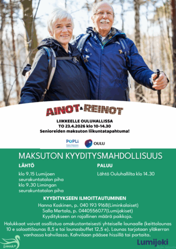 Aika: ke 22.4.2026 klo 17:30–19:30 Paikka: Lumijoen koulun ruokasali (Poutalantie 1) Kenelle: kaikille lumijokisille – tervetuloa yksin, kaverin tai perheen kanssa