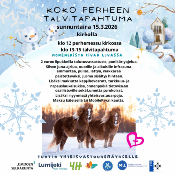 View Calendar 15.3.2026 13:00 - 15:00 Koko perheen talvitapahtuma 15.3.2026 Klo 12 perhemessu kirkossa Klo 13 talvitapahtuma