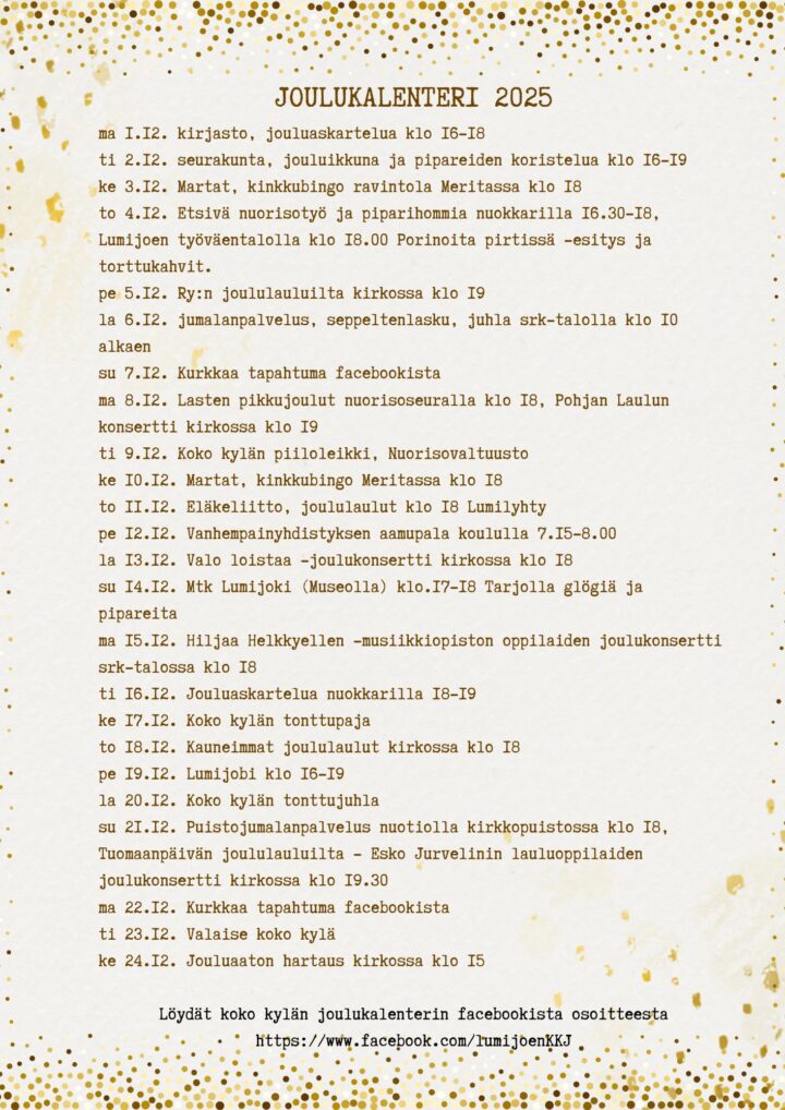 Koko Kylän Joulukalenteri toteutetaan Lumijoen kunnassa kuntalaisten, yhteisöjen ja yhdistysten toimin. Tapahtumat ovat kaikille avoimia ja maksuttomia. Tervetuloa!