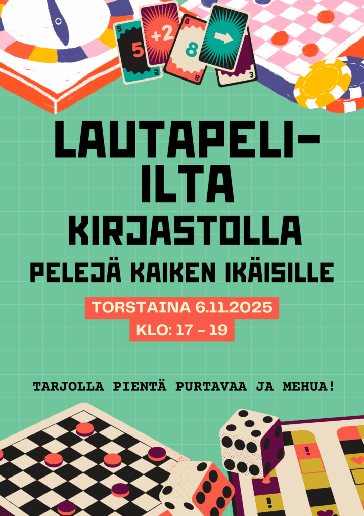 Tervetuloa kirjastolle lautapeli-iltaan to 6.11. klo 17-19. Tarjolla pientä purtavaa ja mehua.Tältä sivulta löydät mielenkiintoisia lastenkirjailijoiden haastatteluita, parhaat lukuvinkit eri-ikäisille sekä paljon inspiroivaa puuhaa ja ideoita