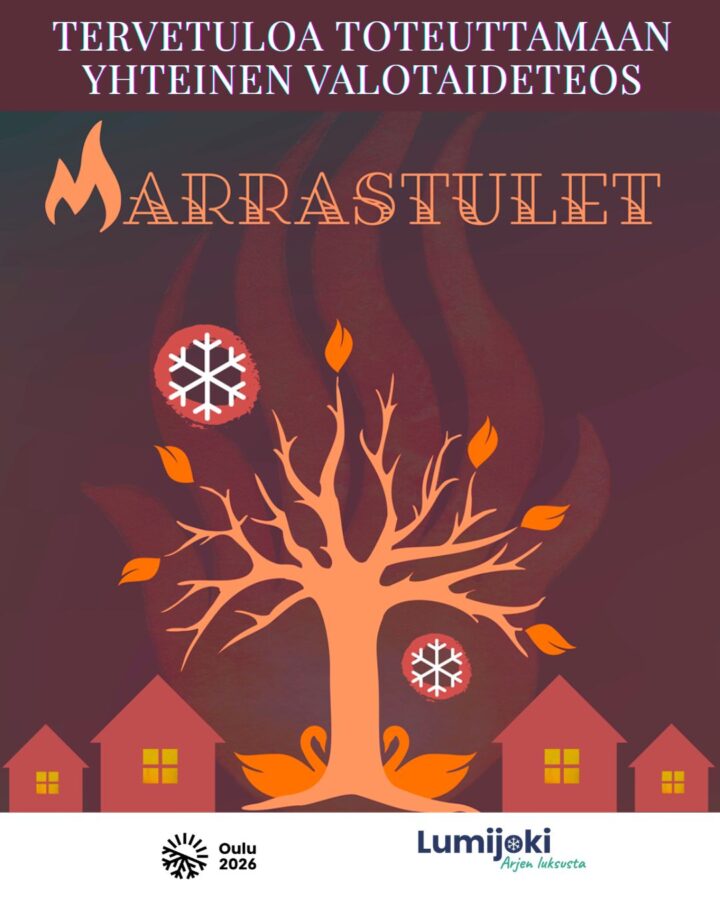 Kutsumme Lumijoen varhaiskasvatuksen ja perusopetuksen, yritykset ja yhdistykset, yksityiset ja yhteisöt tähän yhteisölliseen marraskuun pimeyden valaisevan Marrastulet-valoteoksen valmistamiseen!