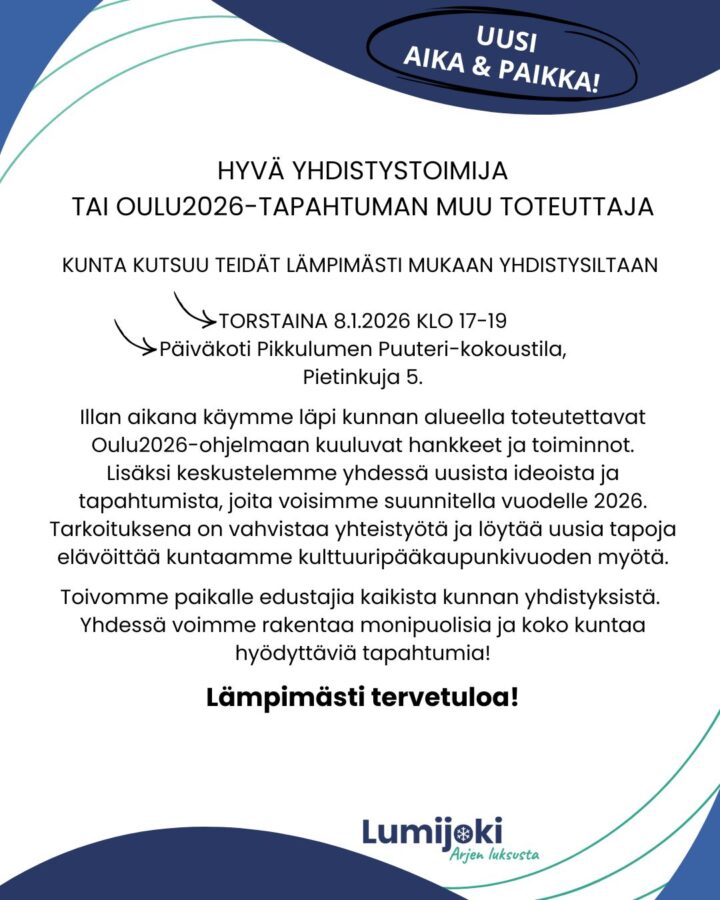Illan aikana käymme läpi kunnan alueella toteutettavat Oulu2026-ohjelmaan kuuluvat hankkeet ja toiminnot. Lisäksi keskustelemme yhdessä uusista ideoista ja tapahtumista, joita voisimme suunnitella vuodelle 2026. Tarkoituksena on vahvistaa yhteistyötä ja löytää uusia tapoja elävöittää kuntaamme kulttuuripääkaupunkivuoden myötä.